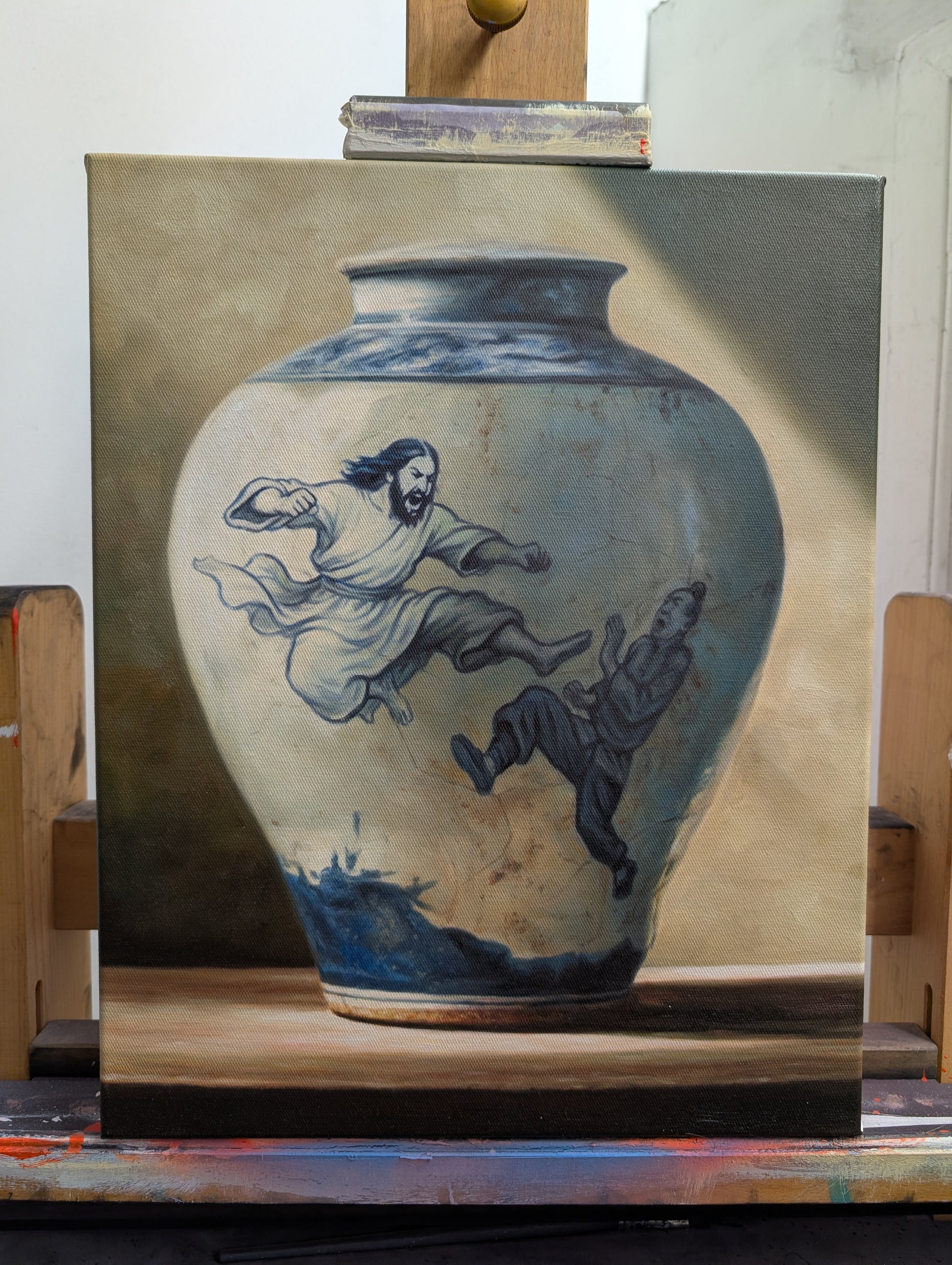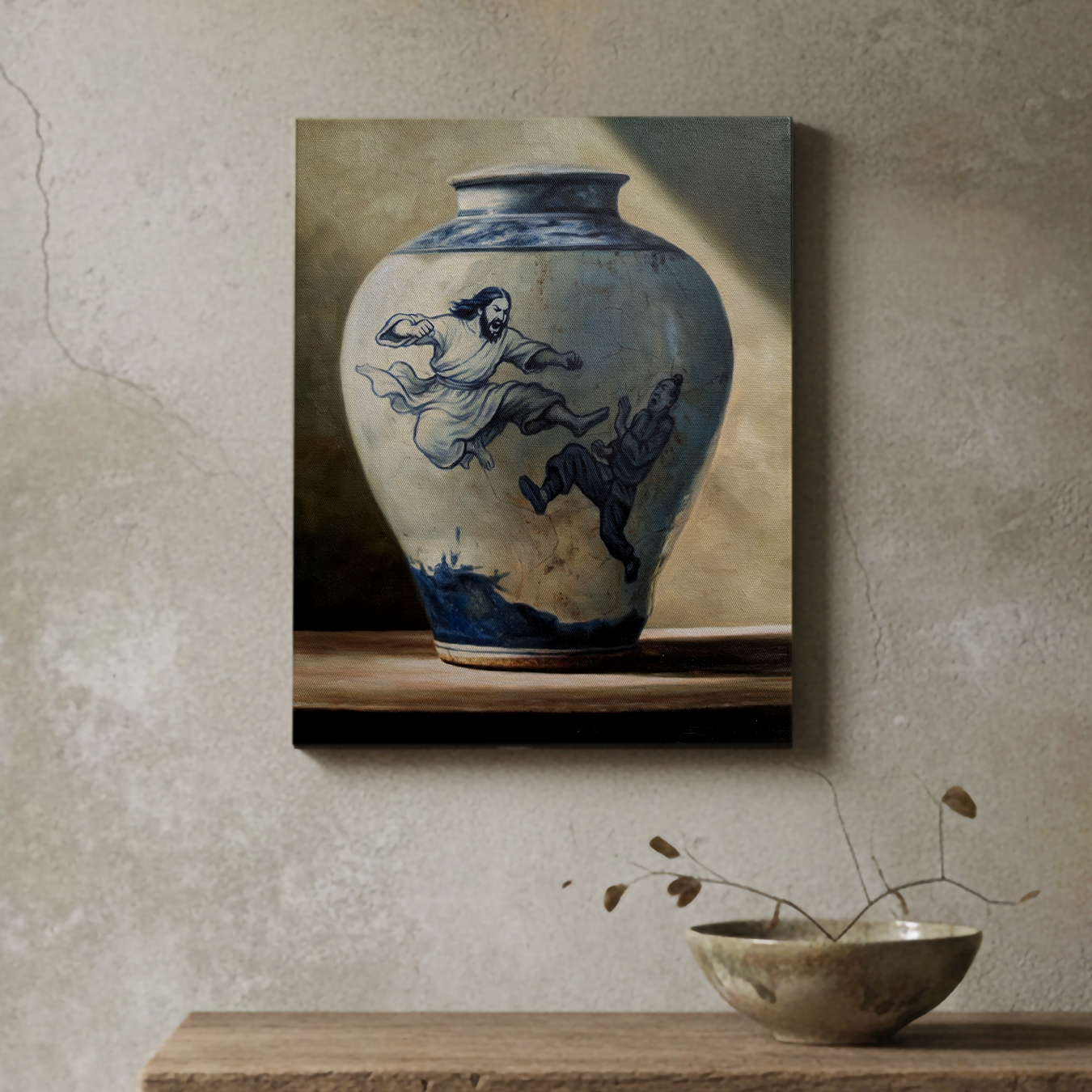 In this artefact of the Chinese Jesus Multiverse The Lord is fighting once more with the merchants at the temple using a Side Winder Kung Fu kick.
